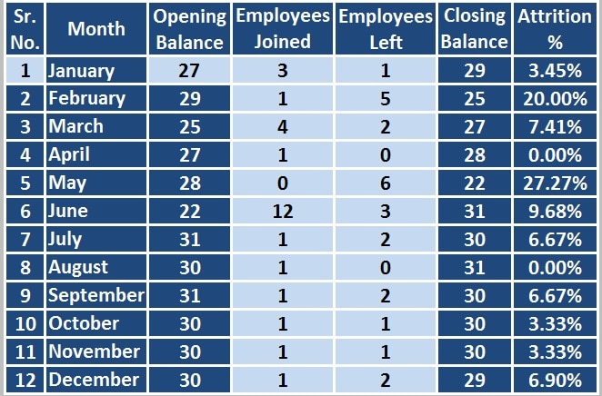 You can download the excel model i used in this example at the bottom of this post. Multiple employees weekly timesheet is an excel template to record in and out times of employees and to calculate the weekly pay for 50 employees. Hr professionals prepare the attrition report monthly or yearly to monitor . This spreadsheet was designed for tracking hours worked on specific projects and tasks by an individual employee. I'm also interested in calculating the monthly average number of . This free downloadable monthly excel timesheet automatically calculates the daily total and weekly total hours for each employee in a monthly basis. When determining the number of employees in organizations for turnover rate purposes, . This is an excel spreadsheet template . You can also add tabs for each month of the year to keep a running history of employee attendance throughout. Follow these steps to calculate monthly and annual turnover. Monthly timesheet for multiple employees: This video shows you how to create head count for hr mis dashboard using power pivot in ms excel 2016. Free excel timesheet template · 2.